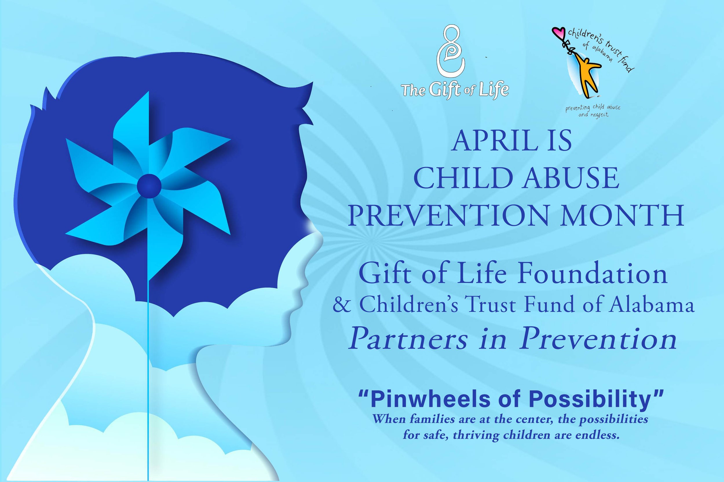 April is National Child Abuse Prevention Month, and Gift of Life Foundation is dedicated to raising awareness and providing education and support to the families we serve that reduces parental stress and lowers the risks for neglect and child abuse in all its forms. Together with the Alabama Department of Child Abuse and Neglect Prevention, we're keeping families at the center and expanding the possibilities for safe, thriving children across Alabama.